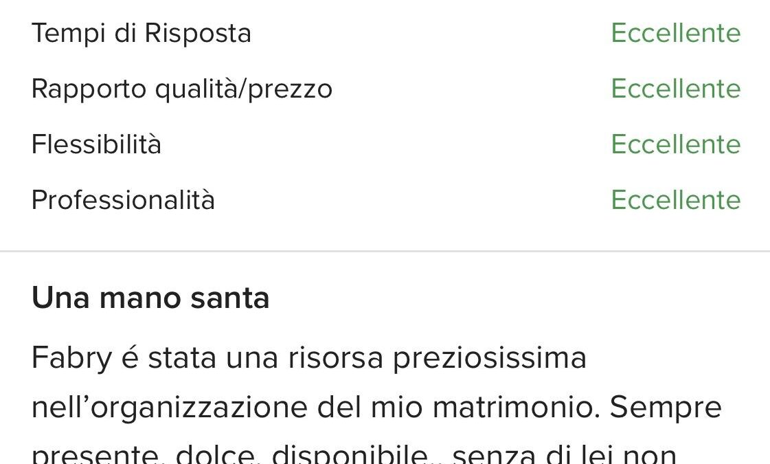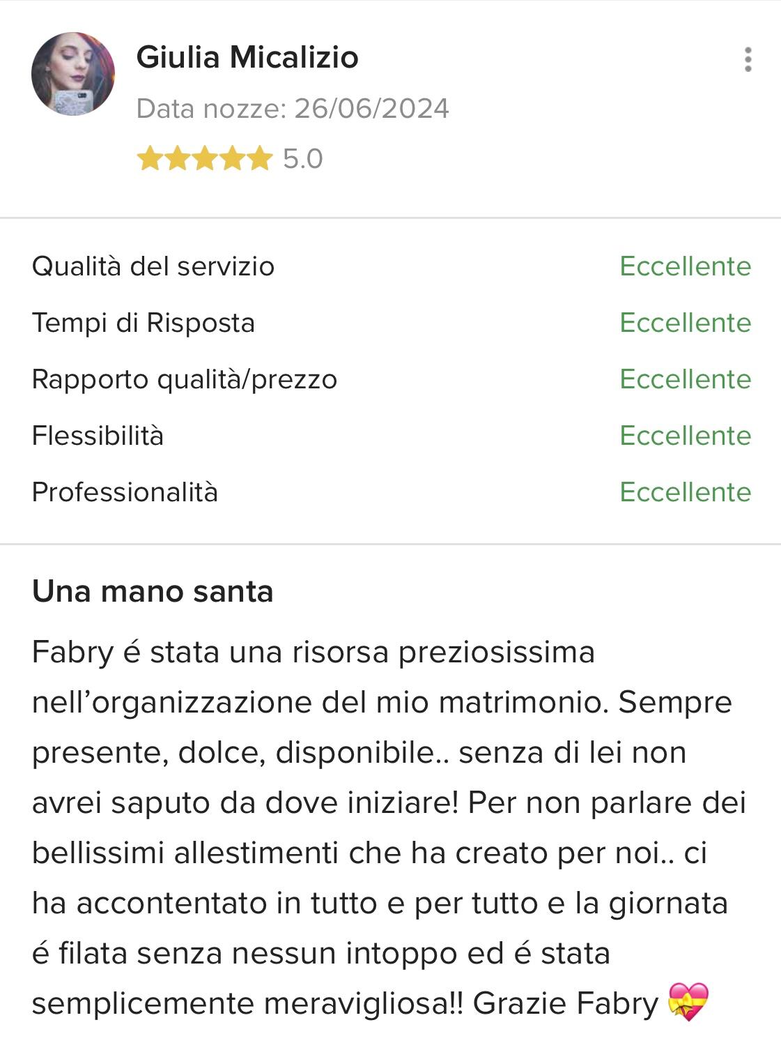 Fabry é stata una risorsa preziosissima nell’organizzazione del mio matrimonio. Sempre presente, dolce, disponibile .. senza di lei non avrei saputo da dove iniziare! Per non parlare dei bellissimi allestimenti che ha creato per noi .. ci ha accontentato in tutto e per tutto e la giornata é filata senza nessun intoppo ed é stata semplicemente meravigliosa!! Grazie Fabry
